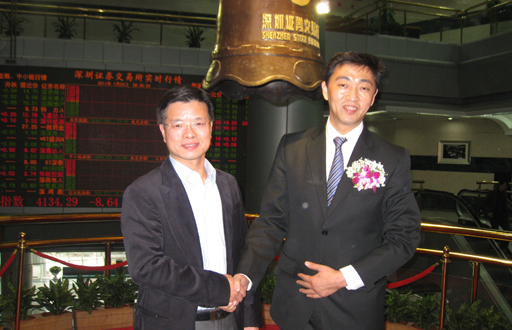 浙商創(chuàng)投管理公司董事長(zhǎng)陳越孟(左一)與迪威視訊董事長(zhǎng)、總經(jīng)理季剛(右一)共賀迪威視訊上市