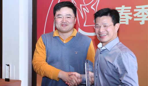 浙商創投董事長陳越孟(右)為北京供電福斯特開關設備公司總經理韓炳軍(左)頒得“總桿亞軍”