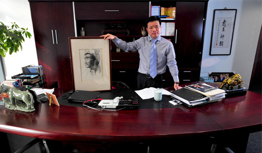 再往里走,拐個彎,直到盡頭,便到達了陳越孟的辦公室。墻上的幾幅字畫,壁櫥內的幾座古典雕像,明顯傳遞出主人的那種獨特的、高品位的江南文人氣息。面前的陳越孟,舉止儒雅而又談吐率真。而隨著訪談的深入,陳越孟則又顯得熱情洋溢、思維縝密。